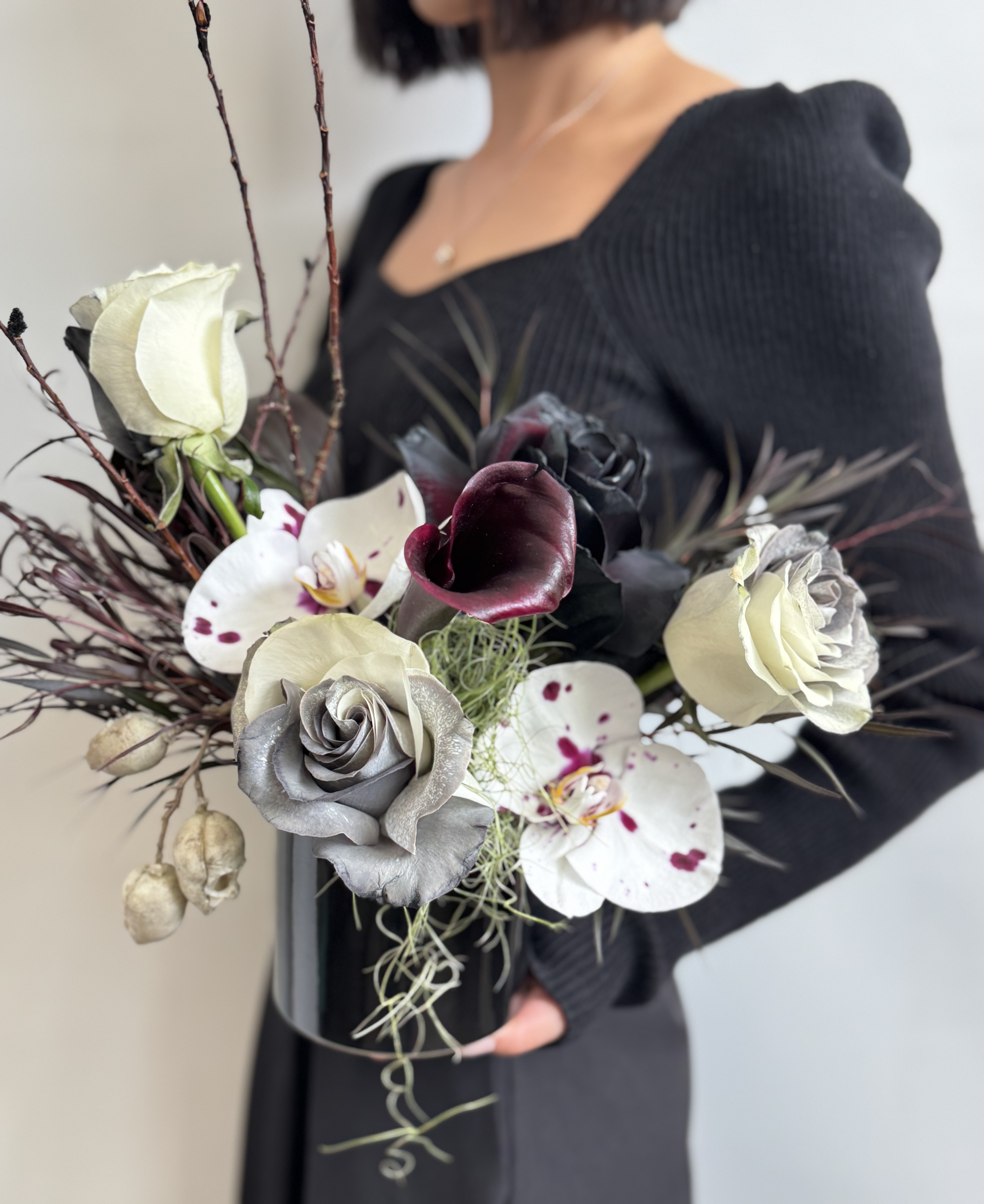 Noir Botanica — sculptural blooms, black and moody tones, quiet drama.