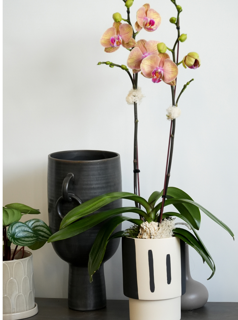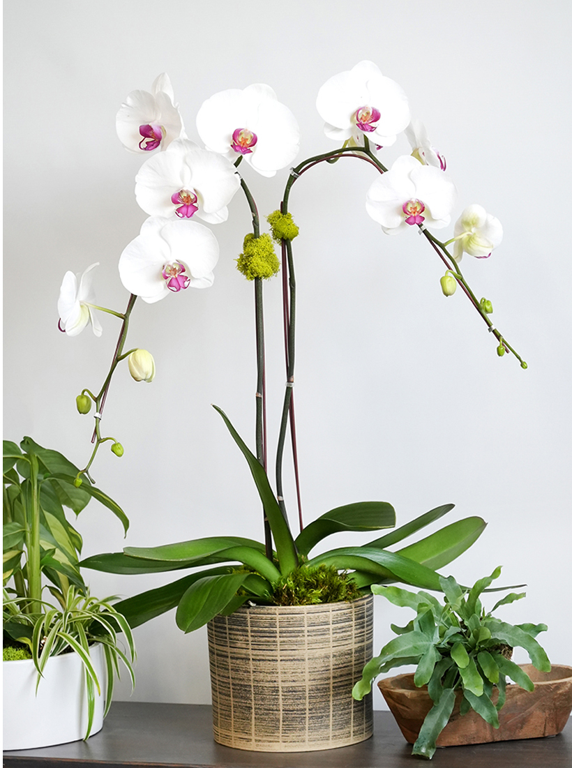 We start by selecting healthy long-lasting orchids and design with utmost attention to color, line and texture. Each style represents the orchid species with relative orchid staging and your choice of orchid number, orchid color and container style.