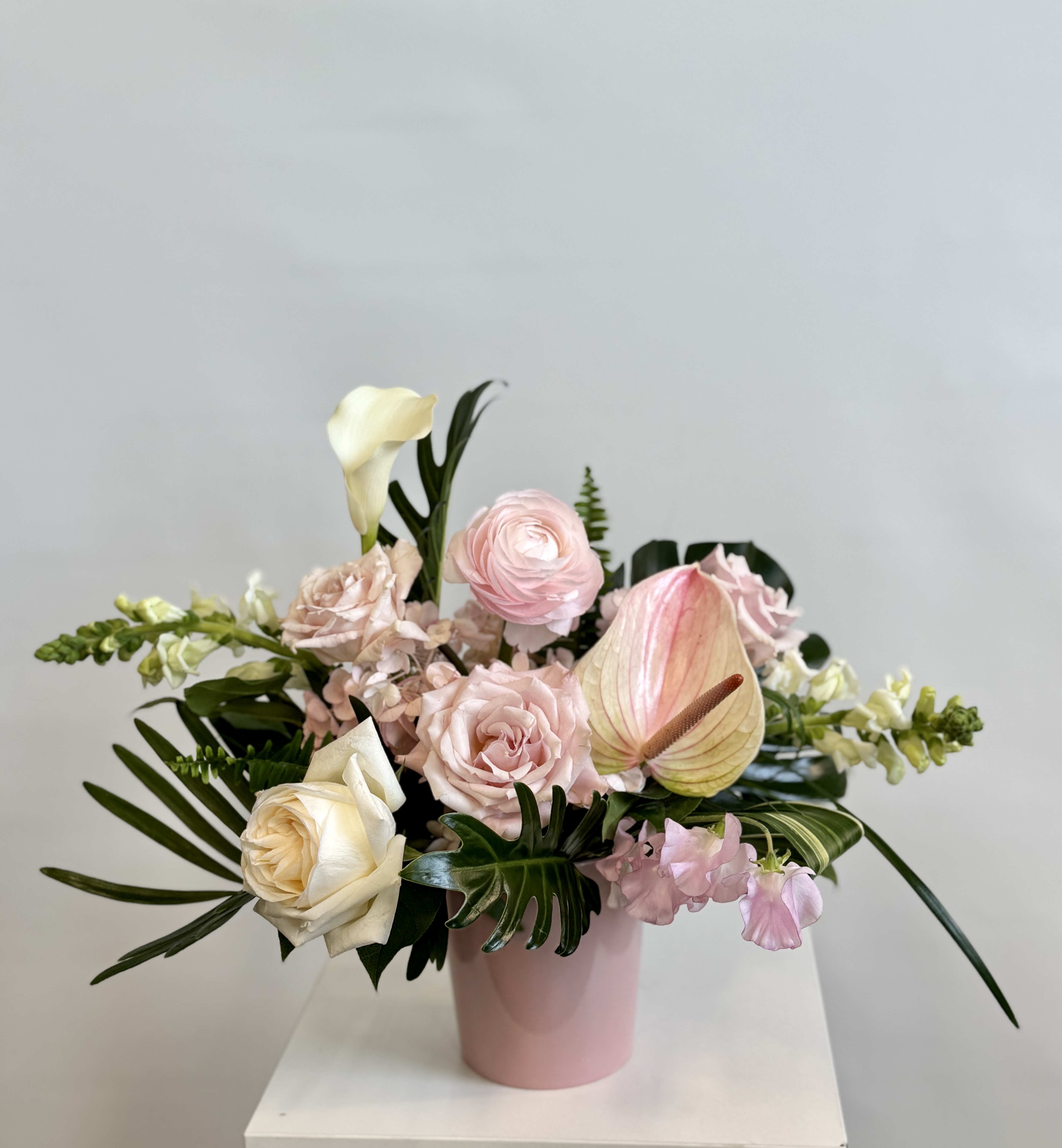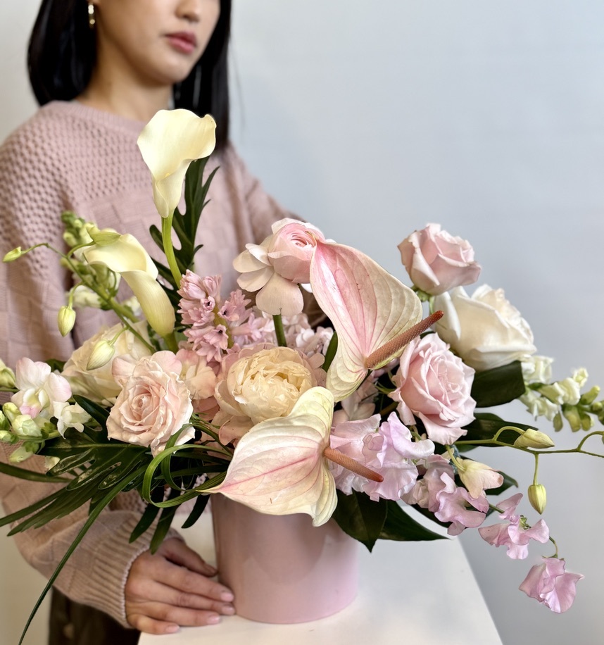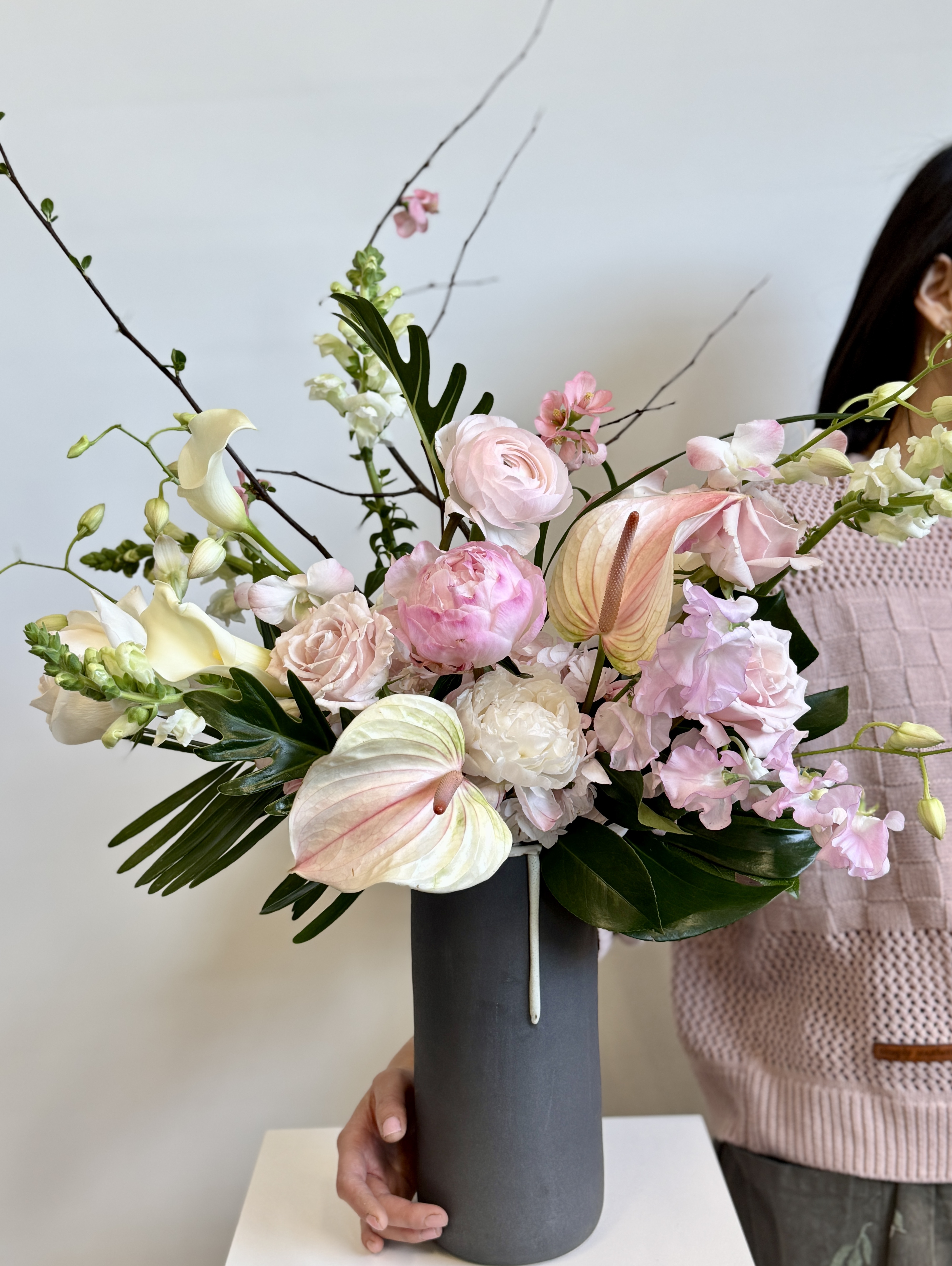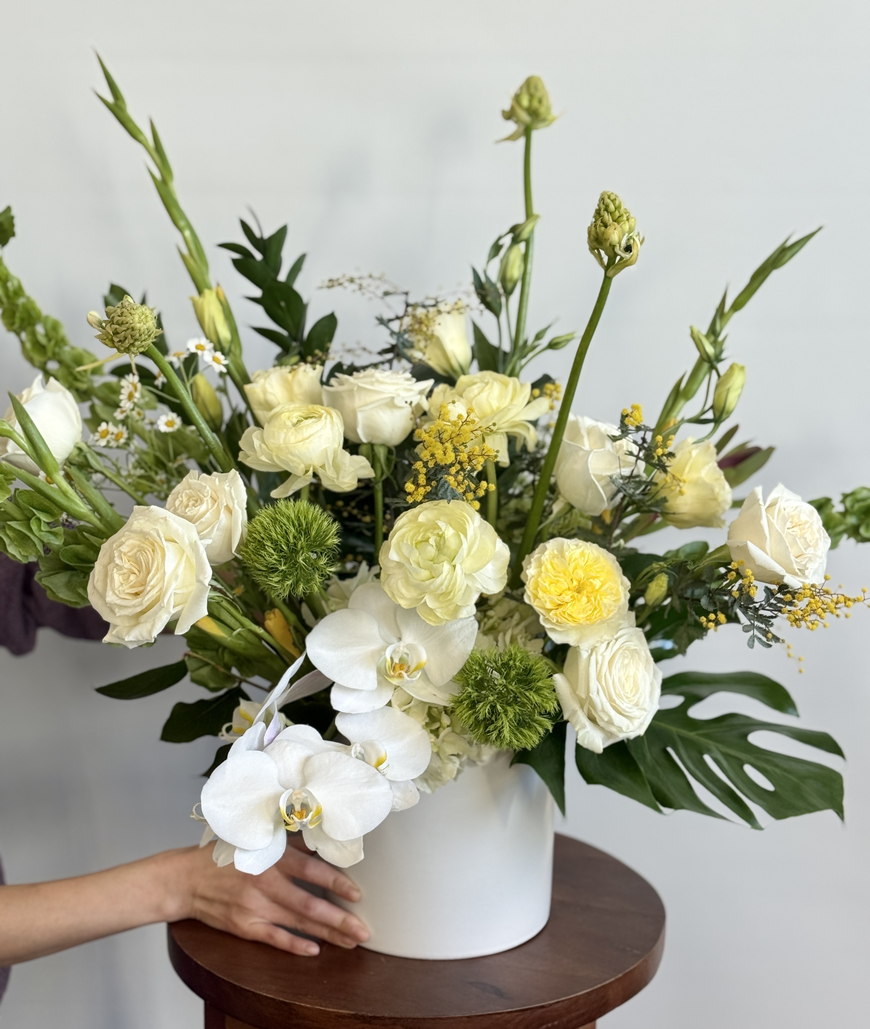 CLEAN SLATE A fresh-start palette designed to feel like a reset: luminous ivory, pale yellow roses, and soft ranunculus, lifted with bright greens and Bells of Ireland.